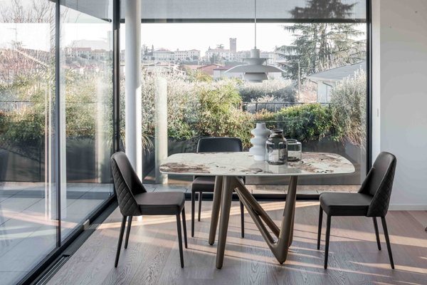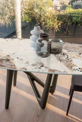 Compar Design. Andrea Lucatello Dimensions : l 150 x h 75 x p 100 cm La table Esse est dynamique et résolument innovante, tant sur le plan esthétique que fonctionnel. Un pont imaginaire pour créer la table de vos rêves. Objet sculptural, sa structure s'entrelace comme les doigts d'une main, soutenant délicatement le plateau en céramique Verde Alpi, présenté ici, et accompagnant ses mouvements. Polyvalente et exclusive, elle est idéale pour accueillir des invités de dernière minute dans un confort absolu.