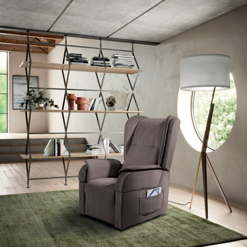 Il Benessere Dimensions : l 79 x h 114 x p 86/182 cm Structure en fer et contreplaqué Assise standard en mousse à mémoire de forme Kit de roulettes standard avec grandes roues Mécanisme Emme Plus Accoudoirs extensibles standard Système o-Gravity inclus Rehausse verticale +10 cm Disponible en tissu et en cuir Housses partiellement déhoussables fauteuil relax et relaxation releveur