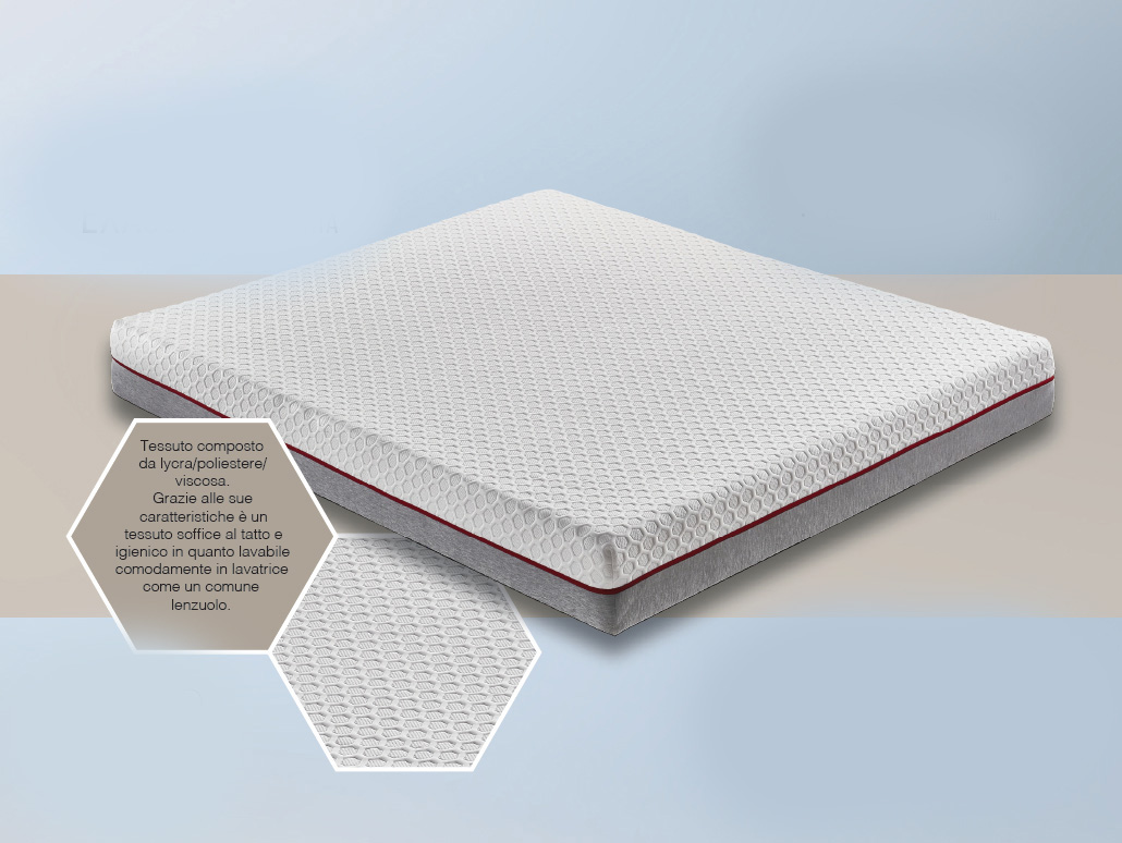 Il Benessere Tissu composé de Lycra, de polyester et de viscose. Grâce à ses caractéristiques, il est doux au toucher et hygiénique car il se lave facilement en machine comme un drap classique. Housse en tissu PL 400 g résistant et respirant. Fermeture éclair centrale sur les 4 côtés. housse matelas