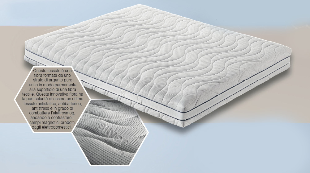 Il Benessere Ce tissu est composé d'une fibre constituée d'une couche d'argent pur fixée de façon permanente à sa surface. Cette fibre innovante est unique en son genre : elle est antistatique, antibactérienne et antistress, et peut lutter contre la pollution électromagnétique en neutralisant les champs magnétiques produits par les appareils ménagers. Revêtement en tissu argenté enrichi en ions d'argent. Motif losange continu. Fermeture éclair sur les 4 côtés. Bandeau respirant 3D. Rembourrage : Tecnofibre - PL 300 g. housse matelas