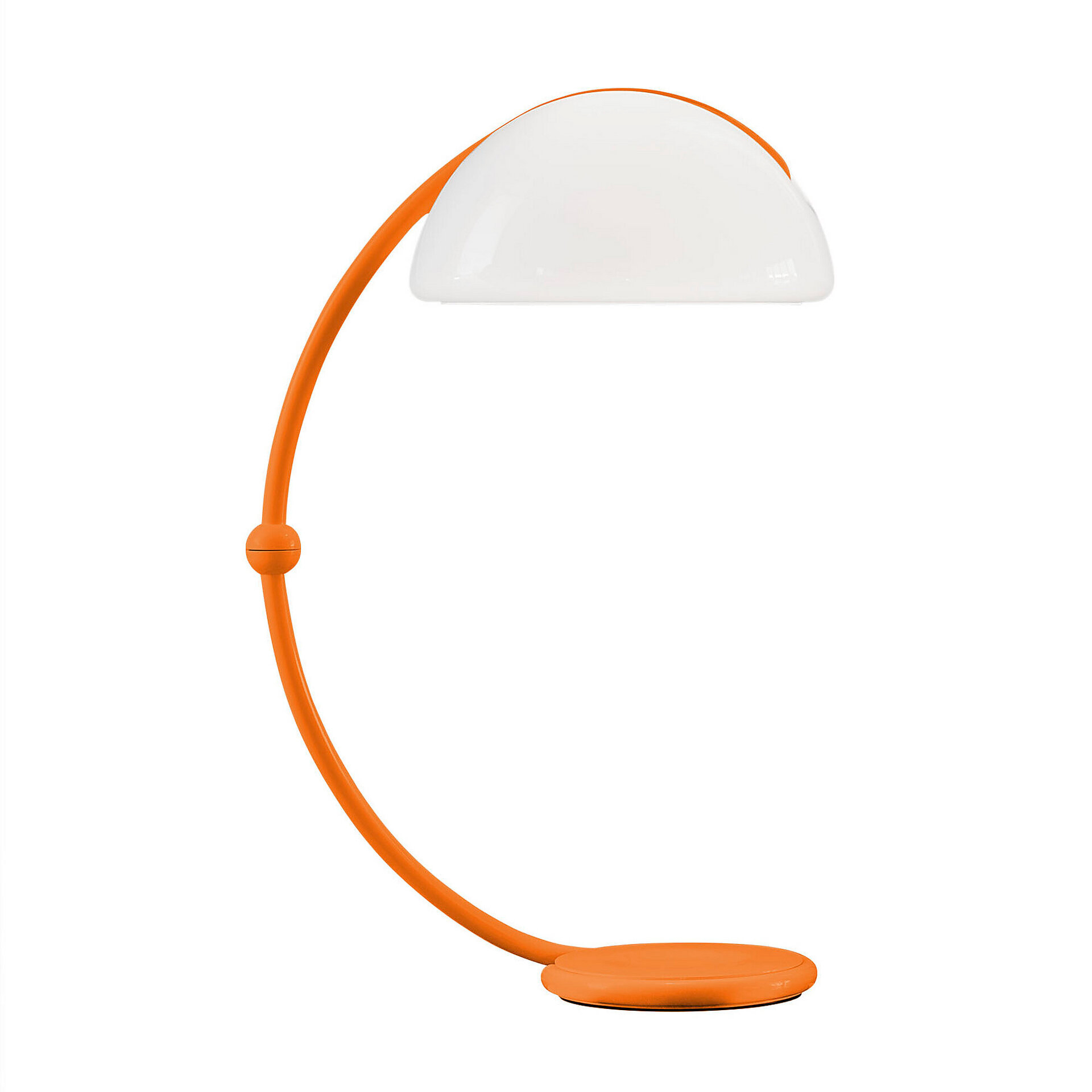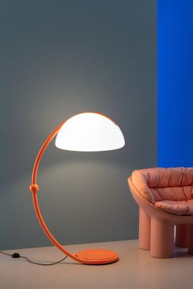 Martinelli Luce Design. Elio Martinelli, Réf. 2131 - 60 anni Dimensions : Ø 55 x h 120 cm Serpente est une lampe de sol à lumière diffuse conçue en 1965, réalisée à l'aide de techniques de production innovantes pour l'époque. Le corps est composé d'un bras tubulaire orientable autour d'un pivot central, qui intègre un diffuseur moulé en méthacrylate blanc opale. La forme sinueuse du bras s'enroule autour de la base ronde en métal, conférant équilibre et mouvement à l'ensemble. Pour la réalisation du diffuseur, obtenu par thermoformage et caractérisé par un contre-dépouille complexe, des moules spécifiques ont été conçus en interne. De même, la courbure des bras - élément distinctif de la lampe - a fait l'objet d'une étude technique approfondie, appliquée à la fois à la version de table et à la version sur pied. Couleur de la structure : Orange, poli, RAL 2010 Couleur du diffuseur : Blanc, opal Couleur de base : Orange, poli, RAL 2010 Matériau de la structure : Fer Matériau du diffuseur : Méthacrylate 040 Matériau de base : Fer lampe de sol