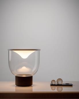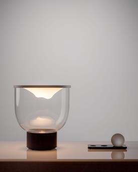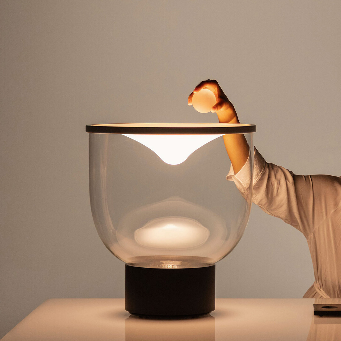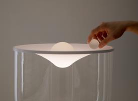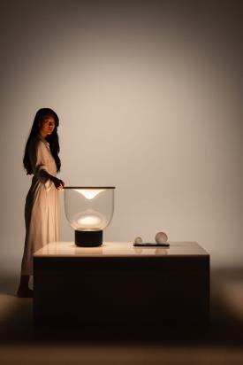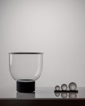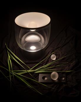 Martinelli Luce Design. Min Dong Studio Habits, Réf. 838 Dimensions : Ø 40 x h 46 cm Lampe de table dynamique à lumière diffuse LED. Dimmable. Base en aluminium peint, structure en verre borosilicaté, membrane supérieure en Lycra® La lampe est livrée avec 3 sphères en verre borosilicaté de poids différents : 0,3 kg, 0,7 kg et 1,3 kg. Le nombre et le poids des sphères placées sur le tissu modifient l'intensité et la tonalité de la lumière émise par une source LED à blanc dynamique : avec des poids légers, l'éclairage est plus délicat et chaud ; en ajoutant des sphères, il devient plus fort et plus froid. La base porte-sphères est fabriquée en PaperStone®, un matériau certifié FSC®, sans formaldéhyde ni COV. Fabriqué à partir de papier 100 % recyclé et de résines d'origine végétale PetroFree™. Des pigments naturels remplacent les colorants chimiques pour garantir une meilleure résistance aux rayons UV et une meilleure stabilité des couleurs. La même résistance que l'acier, la même beauté que la pierre. Chaque plaque est unique. Couleur de la structure : Transparent Couleur du réflecteur : Blanc Couleur du diffuseur : Transparent Couleur de base : Noir, opaque, RAL 9005 Couleur des éléments : Blanc, opal Matériau de la structure : Verre Matériau du réflecteur : Lycra® Matériau du diffuseur : Verre Matériau de base : Aluminium Matériau des Éléments : Verre