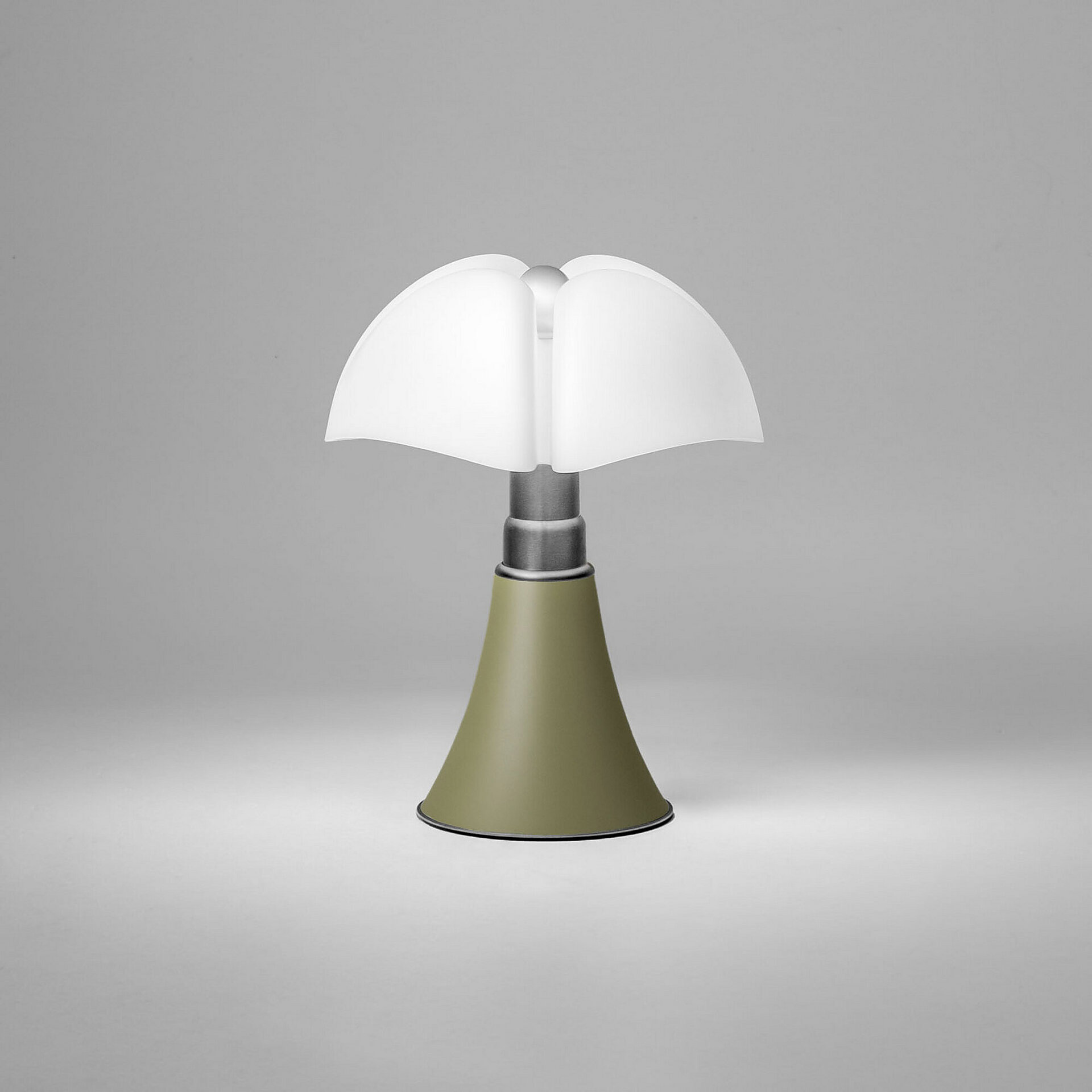 Martinelli Luce Design. Gae Aulenti, Réf. 620/J/DIM/T/CL/MO Dimensions : Ø 27 x h 35 cm Version mini de la lampe PIPISTRELLO conçue par Gae Aulenti en 1965. Lampe de table à lumière diffuse. Piètement en acier inoxydable. Diffuseur en méthacrylate blanc. Structure et pommeau en aluminium peint. Version portable, système sans fil rechargeable (chargeur et batterie fournis) via Micro-USB / Type-C, autonomie de 6 heures. Rechargeable également avec des batteries externes compatibles. Capteur tactile sur le corps. Dans la version Mini de chaque Pipistrello, le télescope n'est pas extensible. La forme est conservée, mais pas le mouvement mécanique. Couleur de la structure : Blanc, opal Couleur de base : Chrome, chromé Matériau de la structure : Aluminium, Laiton, Acier inoxydable Matériau du diffuseur : Méthacrylate 040 Matériau de base : Fer lampe de table