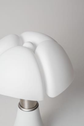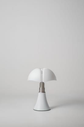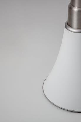 Martinelli Luce Design. Gae Aulenti, Réf. 620/MED/DIM/OP Dimensions : Ø 40 x h 50/62 cm Lampe de table ou de sol à lumière diffuse, réglable en hauteur. Télescope en acier inox satiné. Diffuseur en méthacrylate satiné blanc. Structure et pommeau en aluminium peint mat. Source de lumière à LED, dimmable. Driver électronique avec prise. Couleur de la structure : Blanc, opal Couleur de base : Chrome, chromé Matériau de la structure : Aluminium, Acier inoxydable Matériau du diffuseur : Méthacrylate 040 Matériau de base : Fer