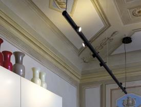 Suspension modulaire. Structure en aluminium peint avec 4 spots orientables et directionnels avec source lumineuse LED intégrée. Drivers électroniques à l'intérieur du rosace à fixer au plafond. Le joint de raccord est également disponible pour l'assemblage de plusieurs modules (code 30869).