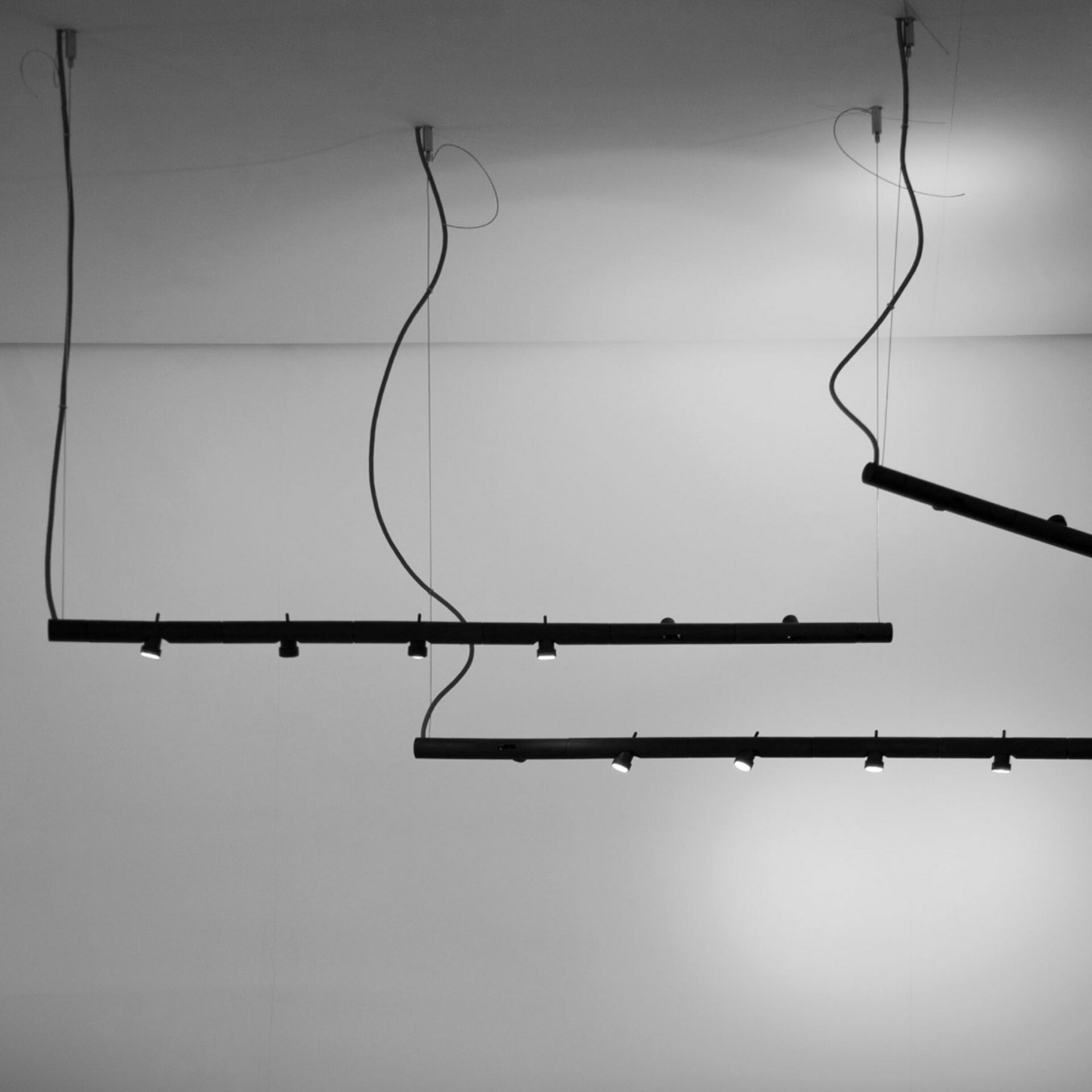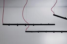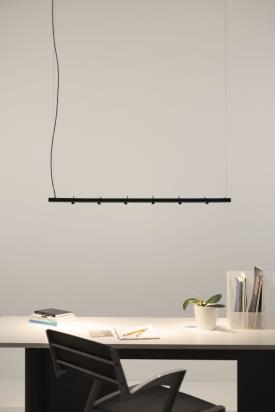 Martinelli Luce Design. Emiliana Martinelli, Réf. 2070 Dimensions : Ø 2,5 x h 100 cm Appareil à suspension, lumière directe/indirecte, orientable avec six têtes articulées et tournantes indépendantes. Structure tubulaire en aluminium peint, suspendue avec des petits câbles en acier. Source de lumière à LED intégrée. Driver inclus dans la base au plafond. Couleurs et matériaux Couleur de la structure : Noir, opaque, RAL 9005 Couleur du diffuseur : Transparent Couleur du rosace : Noir, opaque, RAL 9005 Matériau de la structure : Aluminium Matériau du diffuseur : Polycarbonate Matériau du rosace : Aluminium Typologie :Suspension Usage : Intérieur Puissance : 14 W Tension : 230 V Poids : 1.5 kg lampe suspension