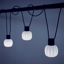 Martinelli Luce Design. Paola Navone, Réf. 21004/3 Dimensions : Ø 14,5 x h 18,5 cm Chaîne de lampes d’extérieur à suspension se composant de 3 éléments fixes sur un câble électrique espacés tous les 100 cm. Elle est avec un câble de 8 m pour l’alimentation de 3 points d’éclairage. Le support est en résine et en caoutchouc moulé couleur noir et il est câblé pour des ampoules à Led. Le diffuseur est en polyéthylène roto moulé. Deux crochets se trouvent à chaque extrémité du câble pour suspendre la chaîne de lampes. La lampe Kiki est en mesure d’éclairer votre jardin et les espaces en plein air. Elle est parfaite pour créer des jeux de lumière, des emplacements fonctionnels mais aussi pour éclairer des allées agréables à vivre. Degré de protection: IP44 prise, IP65 appareil Couleurs et matériaux Couleur de la structure : Noir, opaque, RAL 9005 Couleur du diffuseur : Blanc Couleur des éléments : Noir, opaque, RAL 9005 Matériau de la structure : Résine Matériau du diffuseur : Polyéthylène Typologie :Suspension Usage : Extérieur Puissance : 17 W Tension : 230 V Longueur : 800 cm Poids : 2,1 kg lampe suspension