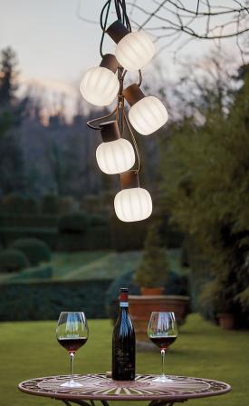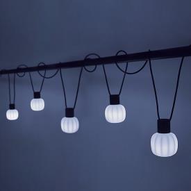 Martinelli Luce Design. Paola Navone, Réf. 21004/5 Dimensions : Ø 14,5 x h 18,5 cm Chaîne de lampes d’extérieur à suspension se composant de 5 éléments fixes sur un câble électrique espacés tous les 100 cm. Elle est avec un câble de 10 m pour l’alimentation de 5 points d’éclairage. Le support est en résine et en caoutchouc moulé couleur noir et il est câblé pour des ampoules à Led. Le diffuseur est en polyéthylène roto moulé. Deux crochets se trouvent à chaque extrémité du câble pour suspendre la chaîne de lampes. La lampe Kiki est en mesure d’éclairer votre jardin et les espaces en plein air. Elle est parfaite pour créer des jeux de lumière, des emplacements fonctionnels mais aussi pour éclairer des allées agréables à vivre. Degré de protection: IP44 prise, IP65 appareil Couleurs et matériaux Couleur de la structure : Noir, opaque, RAL 9005 Couleur du diffuseur : Blanc Couleur des éléments : Noir, opaque, RAL 9005 Matériau de la structure : Résine Matériau du diffuseur : Polyéthylène Typologie :Suspension Usage : Extérieur Puissance : 28 W Tension : 230 V Longueur : 1000 cm Poids : 3 kg lampe suspension