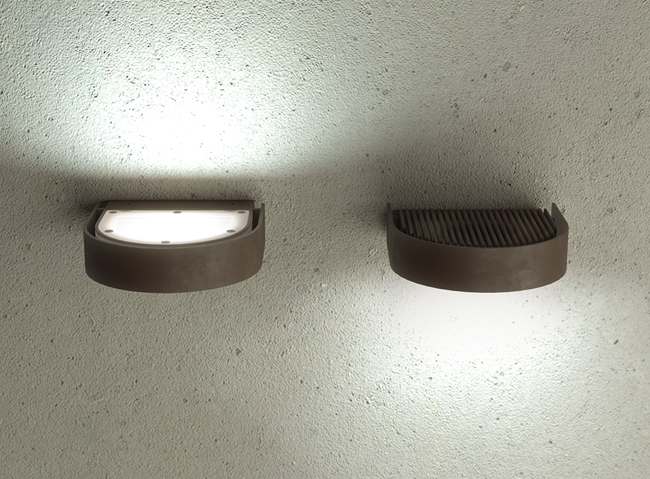 Martinelli Luce Design. Andrea Steidl, Réf. 1464 Dimensions : 17,4 x 17,7 cm Couleurs et matériaux Couleur de la structure : Rouille, peint gaufré Matériau de la structure : Aluminium Usage : Extérieur Puissance : 12 W Tension : 230 V Poids : 2 kg lampe extérieure outdoor